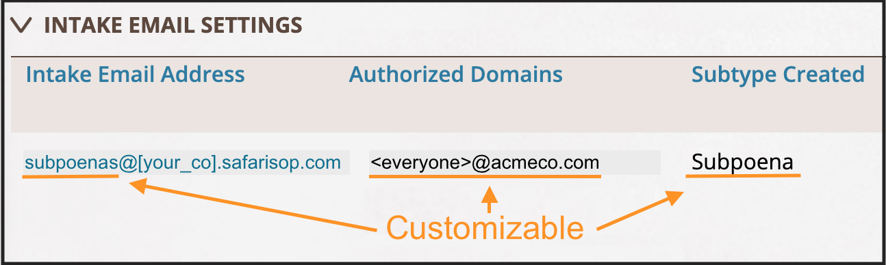 Intake Email Authentication and Security Rules. A Safari Intake Email accepts emails only from domains authorized by your company. Typically, the authorized domain is your company's domain(s) for email address(es). The list of authorized domains are configured as part of the setup of your system -- see the help page about